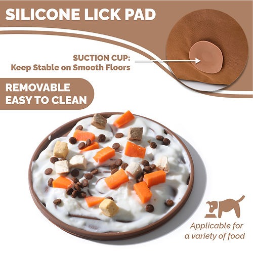 - Functionality takes center stage in our design. Beyond accommodating dry kibbles, the food-grade silicone lick mat easily accommodates wet foods like yogurt. Detach the lick mat for standalone use on smooth surfaces; imagine distraction-packed shower times by affixing it to bathroom walls.