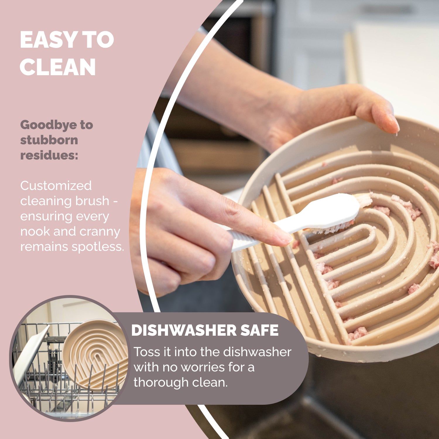 Crafted from durable food-grade silicone, the slow feeder is tailored to promote healthier eating habits and prevent common digestion issues in your beloved pets. The large strong suction at the back can keep the bowl stable from being easily moved around or flipped over. Say goodbye to nasty bowls by quickly brushing it after every use with the brush to avoid any deposit. The bowl is also dishwasher safe for deep cleaning.